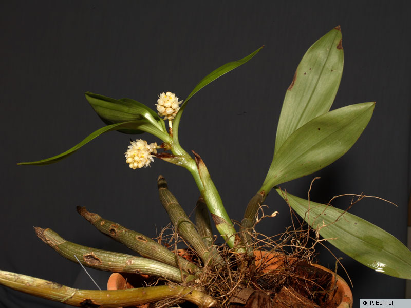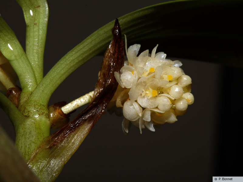 Found in Assam, the eastern Himalayas, Myanmar?, Thailand, Laos and Vietnam at elevations of 600-1600 meters as a mini-miniature sized, warm to cool growing epiphyte warm to cool growing epiphyte or lithophyte on shady cliffs with erect, cylindric stems carrying to 4, elliptic, acute, many nerved, basally clasping leaves that blooms in the spring through summer on 1 to 2, axillary, short, globose, densely many flowered inflorescence