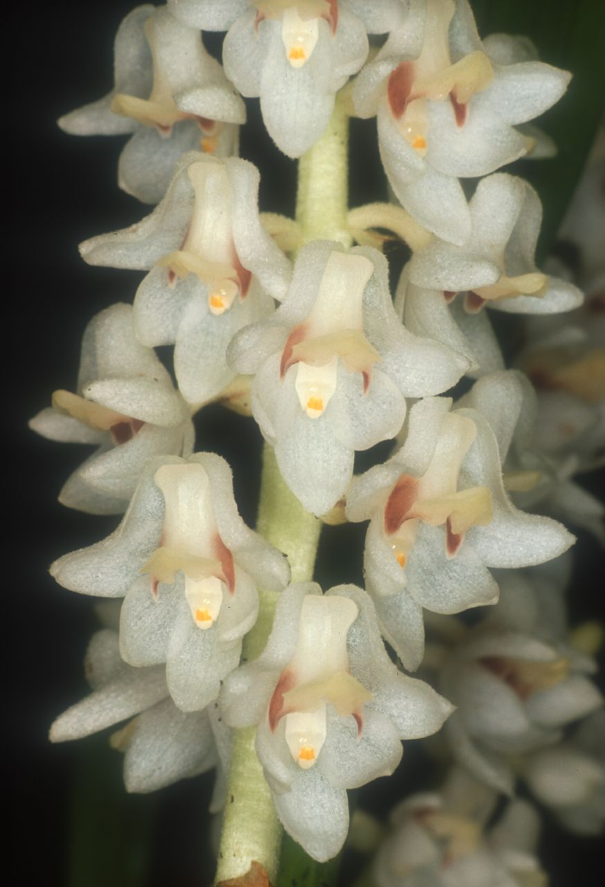 A small sized, warm to cool growing epiphyte or lithophyte found in the Malaysian penninsula, Sumatra and Java at elevations of 500 to 1700 meters with clustered, oblong, basally sheathed pseudobulbs carrying narrowly lanceolate, petiolate leaves that are held in pairs towards the apex that blooms in the spring on up to 2, erect, white fuzzy, shorter to 10" [to 25 cm], loosely many [20 to 40] flowered, racemose inflorescence with many fragrant [not nice] flowers.