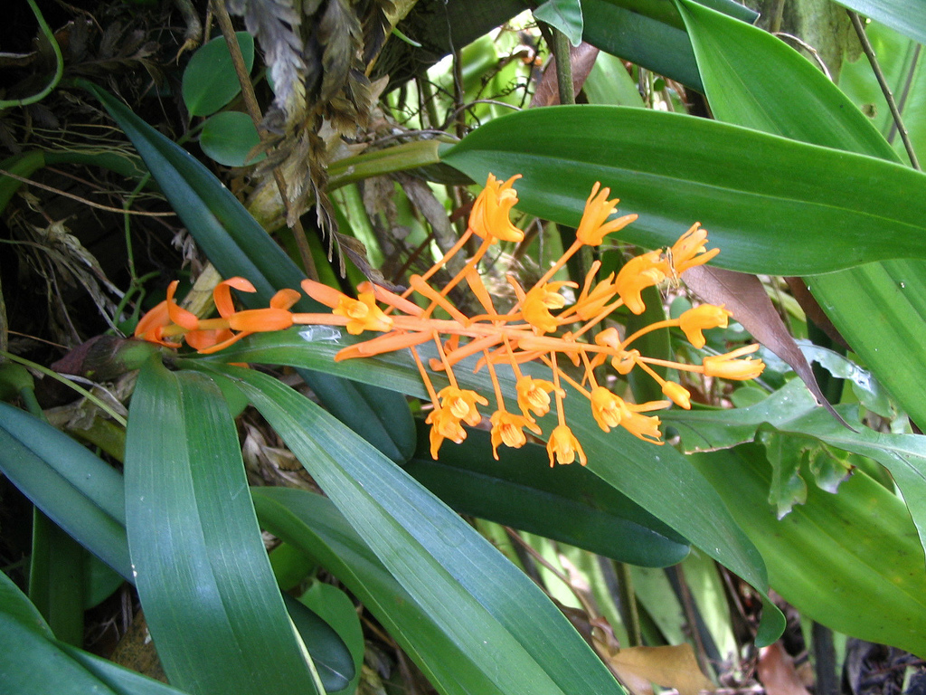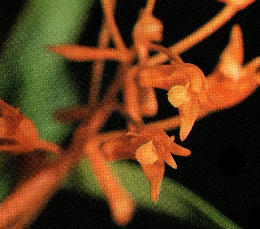 Found in northern Borneo in Podozol forests at elevations of 200 to 500 meters as a miniature sized, hot growing epiphyte with ovoid to oblong, clustered stems carrying 2 to 3, oblong-ligulate, obtuse to subacute, subsessile leaves that blooms in the spring on a subterminal, porrect to erect, 2.4 to 4.8" [6 to 12 cm] long, 6 to 8 flowered inflorescence with several basal bracts and oblong-elliptic, obtuse, deflexed, deep cinnabar-orange floral bracts.