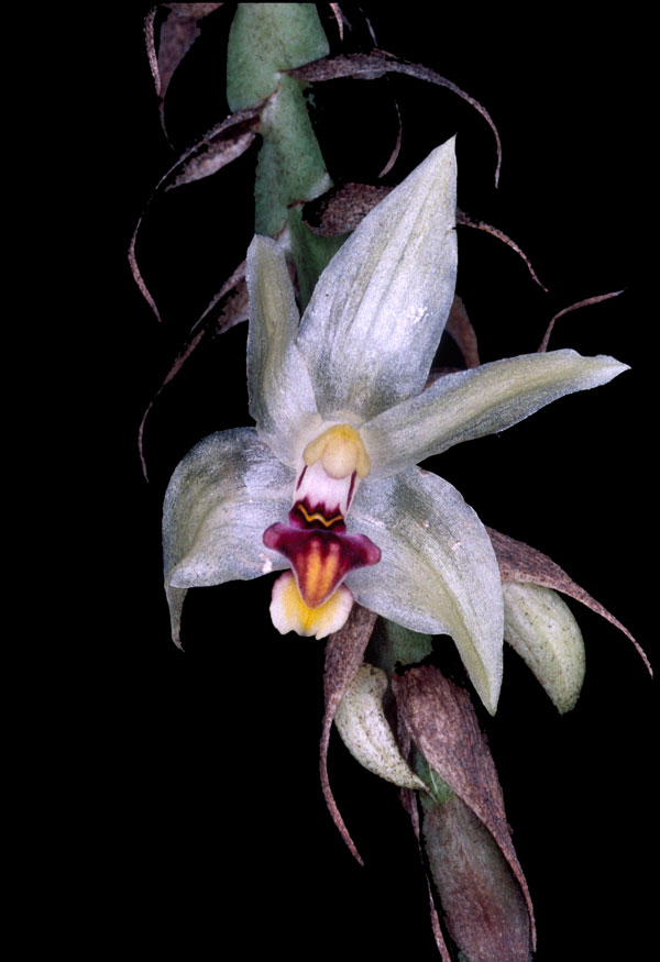 Found in New Guinea in lowland forests on trees at elevations around 300 meters as a medium sized, hot growing epiphyte with ovoid-cylindrical, 4 angled pseudobulbs carrying 3 apical, elliptic-lanceolate, acuminate, narrowing below into the base leaves that blooms in the fall on a 12" [30 cm] long, few flowered inflorescence arising from near the apex of the newest pseudobulb with erect-patent, subimbricate, acuminate, ovate-elliptic bracts