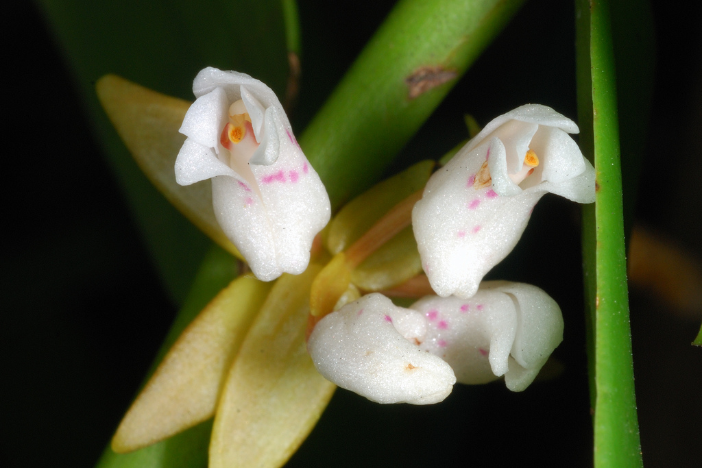 Found in Borneo and Sumatra in hill forests at elevations around 600 meters as a medium sized, warm growing epiphyte with nodding terete stems with 1" [2.5 cm] long internodes, and carrying lanceolate, basally partially clasping leaves and blooms in the spring on more or less sessile, 2.6" [6.5 cm] long, pale green infloresence with 3 to 4, yellow green, ovate, obtuse, fleshy floral bracts and slightly opening, slightly scented flowers.