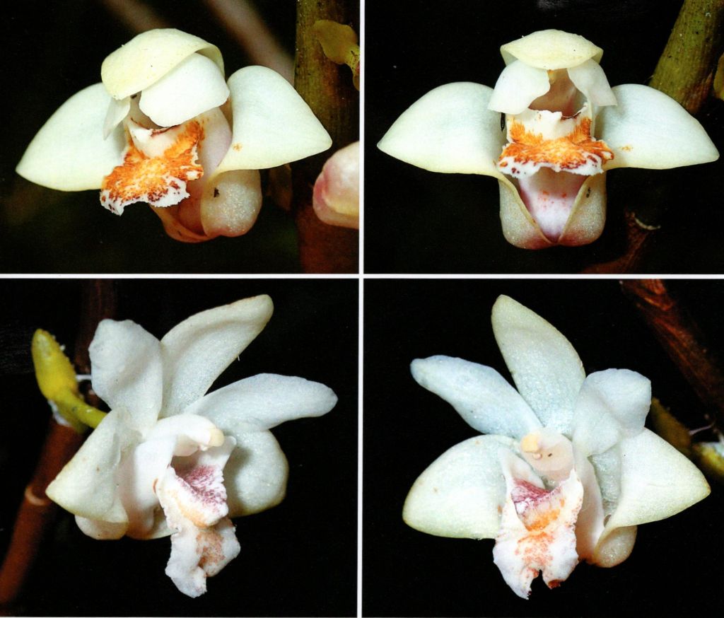 Found in Sabah Borneo in hill forests at elevations of 300 to 400 meters as a large sized, hot growing epiphyte with erect, semi pedulous to pendulous, clustered, simple, cane-like, cylindrical stems enveloped by persistent sheaths in the lower portion, mostly leafy, carrying 3 to 8, lanceolate, tapering gradually to am unequal acute apex, flat, thinly coriaceous, spreading, narrowing below into the basally clasping leaves with emarginate and deeply excised apically, tubular, green with a brown apical margin, persistent sheaths that blooms in the fall on numerous, lateral, emerging through a sheath next to the leaf in the middle to upper portion of the stem, peduncle subsessile, .08 to .16" [2 to 4 mm] long, terete, glabrous, single flowered inflorescence with 3 to 4, glabrous, green floral bracts.