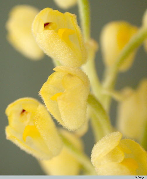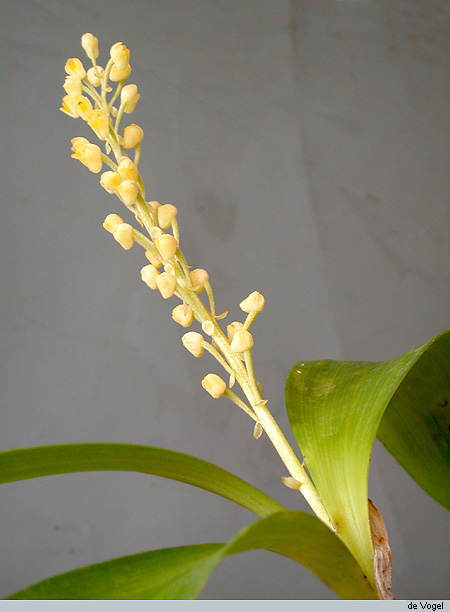 Found in the Moluccas, Sulawesi, New Guinea, Solomon Islands, Samoa and Queensland Australia in lowland forests at elevations of sealevel to 650 meters as a medium sized, hot to warm growing epiphyte with thick, close set, fleshy pseudobulbs enveloped basally by large, conduplicate, triangular sheaths and carrying 3, linear-lanceolate, apically narrowed, narrowly obtuse, narrowing below ito the elongate, petiolate base leaves that blooms in the winter and spring on 2 to 5, erect to horizontal, densely pubescent, densely many flowered, 5 to 7.6" [12.5 to 19 cm] long racemose inflorescence with several, adpressed, oblong-elliptic, obtuse, concave, pubescent bracts and reflexed, ovate to oblong, obtuse, pubescent floral bracts.