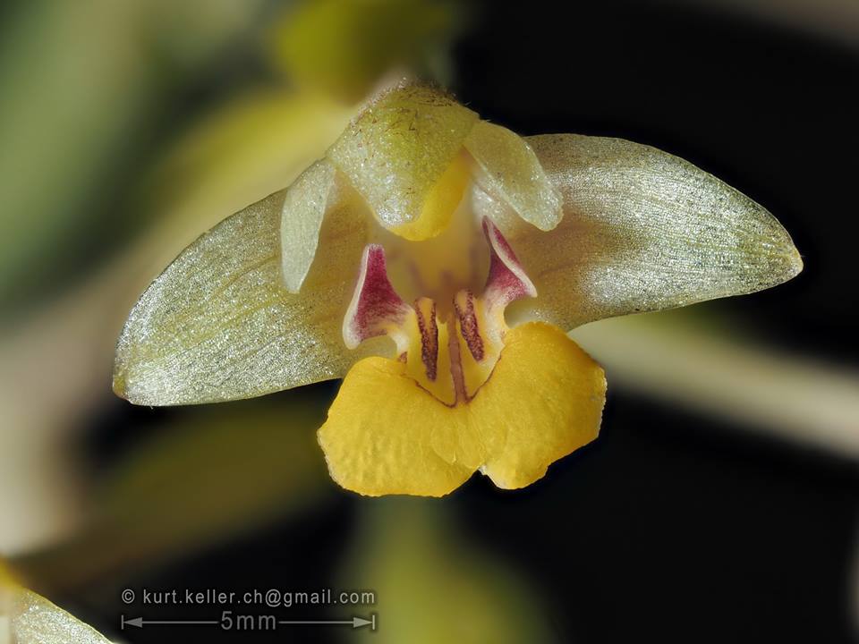 Found in Assam?, the eastern Himalayas?, Myanmar and Thailand as a small sized epiphyte with ovate pseudobulbs carrying 3 apical, linear to linear-spathulate, acute to obtuse, gradually narrowing below into the petiolate base leaves that blooms on 2 from each side for a total of 4, erect to arching, 2 to 6" [5 to 15 cm] long, several flowered inflorescence.