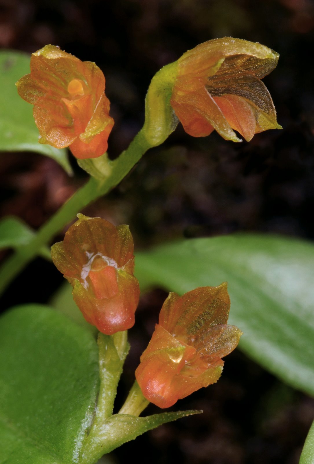 Found in Sumatra in montane forests at elevations around 1100 to 1500 meters as a mini-miniature sized, cool growing terrestrial with very small, almost globose pseudobulbs carrying 2, apical, elliptic, shortly acuminate, narrowing below into the very short petiolate base leaf that blooms in the winter on an erect, thin, glabrous, 1" [2.5 cm] long, 2 to 3 flowered inflorescence.