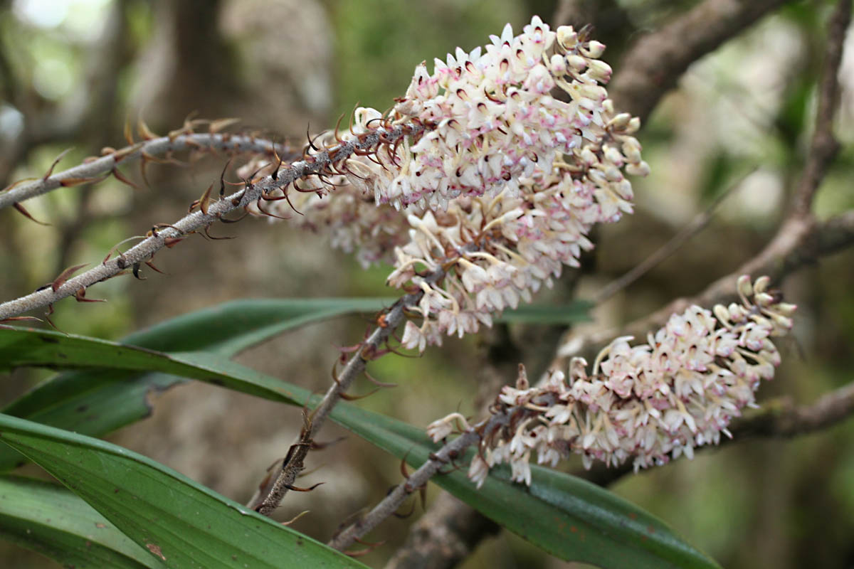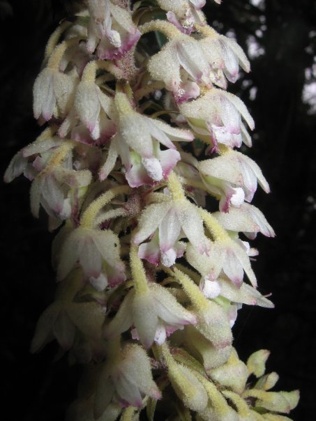 Found in Nueva Ecija of the Philippines at elevations around 1500 meters as a medium sized, cool growing epiphyte with semi-pendulous, curved stems carrying 14, linear-lanceolate leaves that blooms on 3, peduncle to 6.2" [15 .5 cm] long, longest to 9.2" [23 cm] long overall, white pubescent, to 8, acuminate, sterile bracts, densely many flowered inflorescence with strongly acuminate floral bracts and carrying nodding flowers.