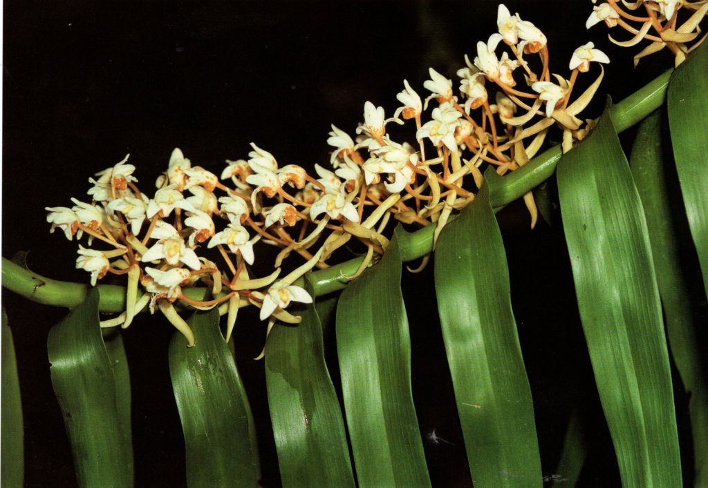 Found in Sabah Borneo in upper hill forests, lower montane forests at elevations of 1000 to 1200 meters as a large sized, cool growing epiphyte or terrestrial in mossy heath forests with an erect to spreading, clustered, to 5 per plant, cane-like, elongate stems carrying in the distal half, lanceolate, iridiform, flat, thinly coriaceous, spreading, tapering gradually into an unequal acute apex, closely clasping base leaves that blooms in the late summer and early fall on many lateral, porrect from node opposite a leaf, peduncle .2 to .6" [.5 to 1.5 cm] long, terete, glabrous, rachis 1,4 to 2" [3.5 to 5 cm] long, terete, slightly angular, fleshy, 6 to 8 flowered inflorescence with lanceolate, acute, white, lower margins involute, as long as to slightly shorter than the ovary floral bracts