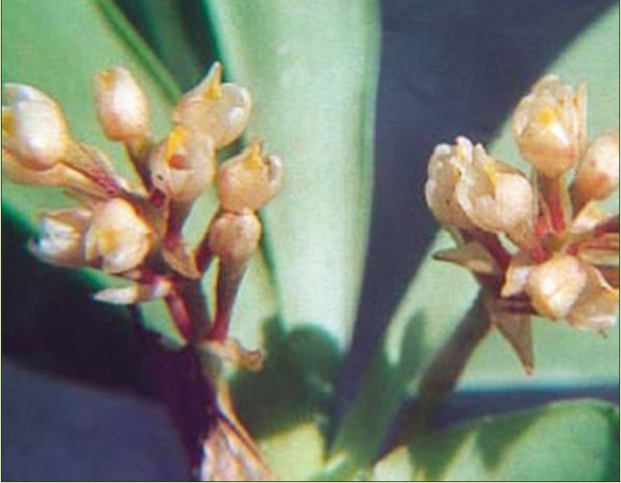Found in Odisha India in semi evergreen moist montane forests at elevations of 1100 meters as a miniature sized, cool growing epiphyte with clavate-fusiform, laterally compressed pseudobulbs carrying 2 to 4, apical, elliptic-lanceolate, acuminate, narrowing below into the articulate sheathing base leaves that blooms in the late summer and early fall on 1 to 3, erect, subterminal, peduncla to .8" [2 cm] long, greenish white, rachis to 3.8" [9.5 cm] long, 10 to 16 flowered inflorescence with slightly longer than the ovary floral bracts.