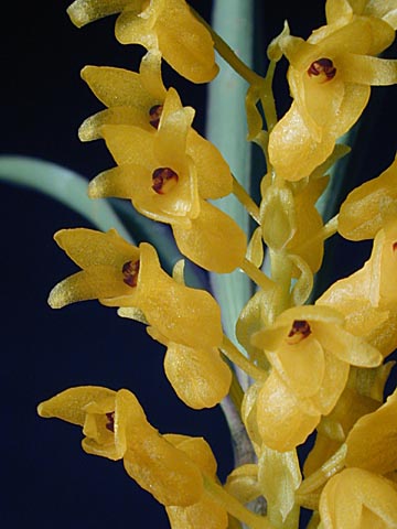 Found in west Sumatra at elevations of 820 to 2500 meters as a small sized, warm to cold growing epiphyte, terrestrial or lithophyte with stem like, basally swollen pseudobulbs carrying 4 apical, linear, narrowed both apically and basally leaves that blooms in the winter on 1 to 2, sparsly pubescent towards the apex, 2.4" [6 cm] long, 5 to 12 flowered racemose inflorescence arising from the leaf axils and has yellow floral bracts and large flowers..