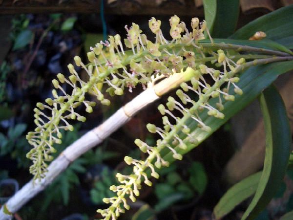 Found in Java and Sumatra at elevations of 1200 to 1800 meters as a medium sized, cool growing epiphyte with an elongate stem carrying 13 to 14, strap-shaped, narrowing towards the unequal apex leaves that blooms on 1 to 3, apical, 8 to 16" [20 to 40 cm] long, many flowered inflorescence with ovate floral bracts