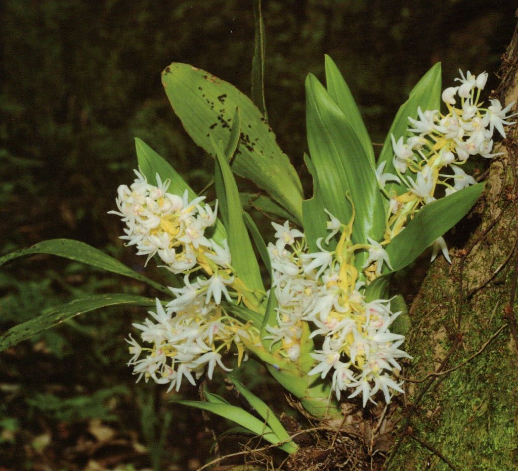 Found in Yunnan, southwestern Guangxi and Hainan provinces of China on trees or in dry open rocky situations on lava-bed at elevations of 700 to 2000 meters as a small sized, warm to cool growing epiphyte or lithophyte with closely spaced, subfusiform pseudobulbs carrying 3 to 4, apical, elliptic to obovate-lanceolate, acute to obtuse leaves that blooms in the spring and summer on a 6" [15 cm] long, few to several flowered inflorescence.