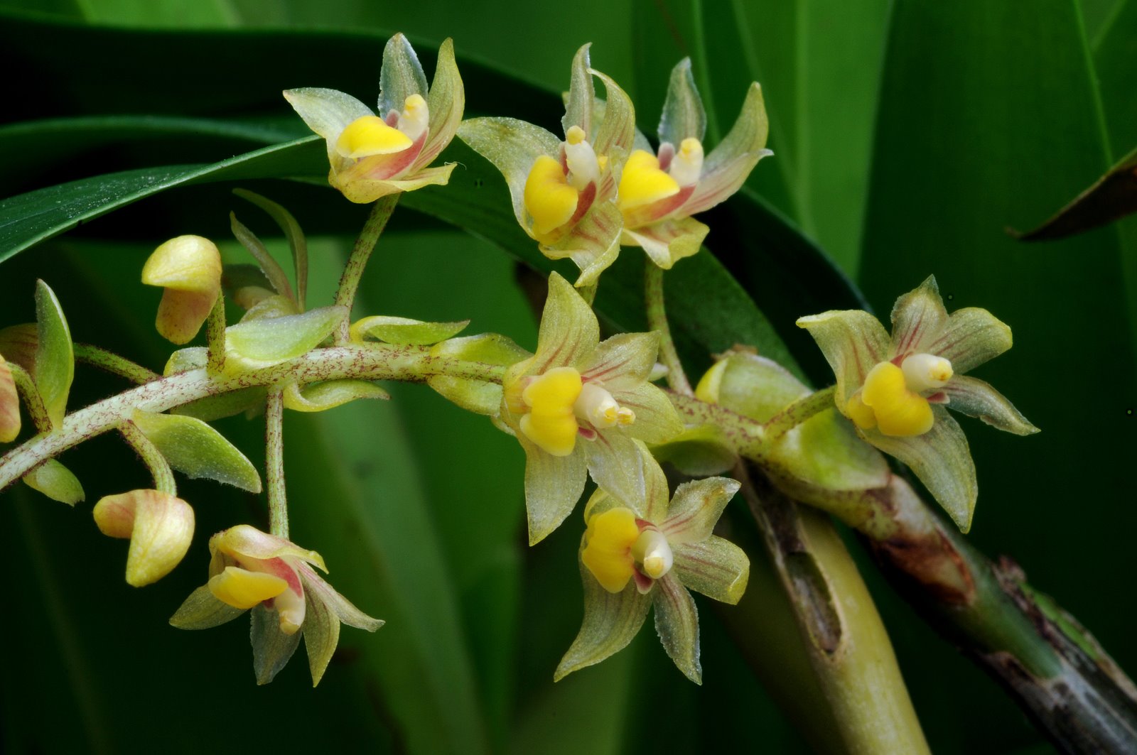 Found in New Guinea, Sulawesi and the Solomon Islands in forests at elevations around 120 to 1400 meters as a medium sized, hot to cool growing epiphyte with clustered, erect to sprawling, soft, thick, fleshy, green often streaked with brown stems enveloped in youth by rather loose, silver to brown tubular, overlapping sheaths and carrying 2 to 4, in a loose fan at the stem apex, lanceolate, thin, tapering to an acute apex leaves that blooms in the spring summer and fall on 1 to 4, on upper stems amongst leaves, suberect to arching, hairless, 2 to 4" [5 to 10 cm] long, to loosely 30 flowered inflorescence