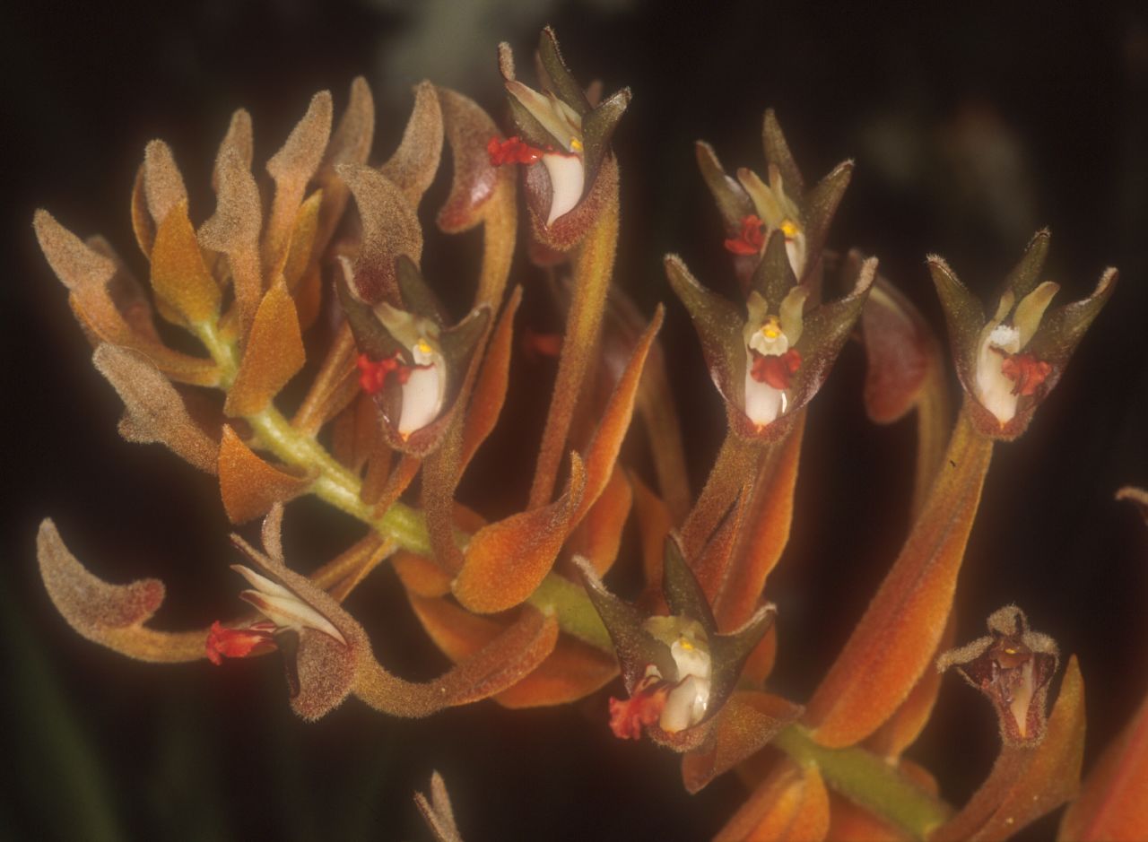 Found in the Himalayas, Thailand, Malaysia, Sumatra, Borneo, Java and the Philippines in lower montane forests on limestone hills at elevations of 300 to 1500 meters as a rare, small to medium sized, hot to cool growing epiphyte that is with dark brown, stiff, woody roots arising from laterally compressed, cylindrical pseudobulbs each separated by 6" [15 cm] and enveloped by basal sheaths carrying 3 to 5 fleshy, elliptic-lanceolate to oblong, acute, narrowing basally into an open channelled petiolate base leaves with the uppermost two being more persistent that blooms in the spring and summer on a ascending or arching, 18" [45 cm] long, several to many flowered racemose inflorescence that has brown hairs and large ovate-lanceolate, orange to red brown bracts and carrying flowers that have a fragrance of vanilla and do not open well.