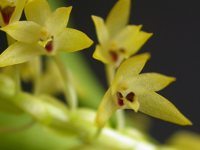 Found in the Ryukyu Islands, Taiwan, Malaysia, Borneo, Sulawesi, New Guinea and the Philippines in forests on tree trunks at elevations of 500 to 1200 meters as a small to medium sized, warm to cool growing epiphyte with erect pseudobulbs carrying up to 4, linear-oblong to oblong lanceolate, unequally bilobed apically leaves that blooms in the winter, spring and summer on an erect, to 9.2" [to 23 cm] long, arising from the top of the pseudobulb, to 45 flowered inflorescence and carrying unpleasantly scented flowers