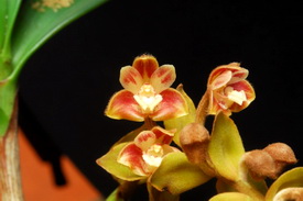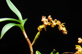 Found in Guangxi and Yunnan provinces of China, Laos and Vietnam on tree trunks or rocks at elevations of 300 to 700 meters as a small to medium sized, hot to warm growing epiphyte or lithophyte with cylindric, several noded pseudobulbs carrying 2 to 4, apical, thickly coriaceous, narrowly oblong leaves that blooms in the spring on a solitary, racemose, usually arising from the middle of the stem, to 9.6" [24 cm] long, densely brown tomentose, many flowered inflorescence with large, brown to yellow green floral bracts.