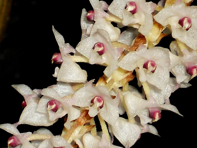 Found on Mt Kerinici in Sumatra at elevations of 2200 to 2700 meters as a medium to large sized, cold growing epiphyte with close set, fleshy, elongate, cylindrical pseudobulbs carrying 4 to 7, linear-lanceolate, obliquely acute leaves that blooms in the late winter and earlier spring on up to 7, to 8" [to 20 cm] long, densely many flowered inflorescence.
