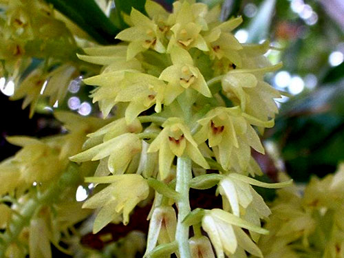 Found in New Guinea in forests at elevations around 1000 to 1700 meters as a small sized, cool growing epiphyte with a short rhizome giving rise to cylindric pseudobulbs carrying 4 to 6, erect-patent, ligulate to elliptic-ligulate, narrowing below into the petiolate base leaves that blooms in the fall on 2 to 4, lateral, erect-patent to arching, 2.8 to 3.2" [7 to 8 cm] long, subdensely 40 to 50 flowered inflorescence with 5 to 6 large oval bracts and carrying reflexed, elliptic, acute, pale green floral bracts and slightly fragrant flowers.