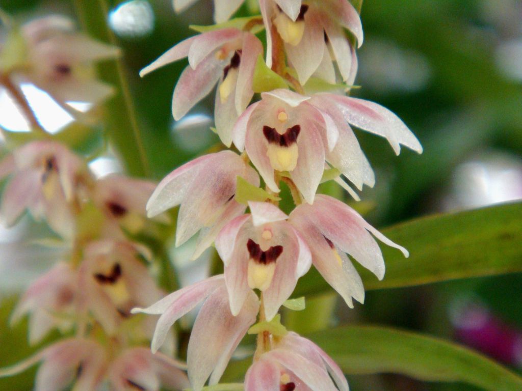 Found only in the Philippines in montane forests at elevations around 2400 meters as a miniature sized, cold growing epiphyte with a woody, creeping rhizome giving rise to thickened, non-bulbous, short, stems carrying a single, apical, and to 4 below, linear-oblong to linear-lanceolate, acute leaves that blooms in the Fall, winter and spring on several, near the apex, 4" [10 cm] long, erect to arching, pubescent, loosely many flowered inflorescence