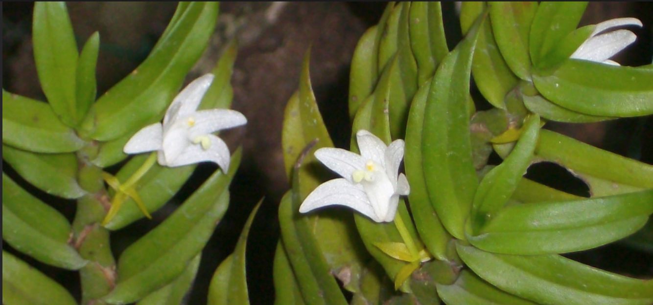 Found in Thailand, Malaysia, Java and Sumatra at elevations around 450 to 1300 meters as a medium sized, hot to cool growing epiphyte or lithophyte with a short rhizome carrying close set, stem-like, slightly swollen in the middle pseudobulbs carrying up to 18, lanceolate, laterally compressed, almost equitant, very uneven and obtuse apically, twisted at the base to face one direction, sessile leaves that blooms in the spring on a short, emerging from the still leafy stem, single flowered inflorescence.