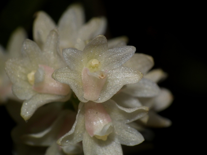 Found only in the Philippines at elevations of sealevel to 60 meters as a small sized, hot growing epiphyte with elongate, branched, compact pseudobulbs carrying 2 to 3, linear-lanceolate, leaves that blooms in the late winter through early summer on a terminal, racemose, shorter than the leaves, 3,2 to 6" [8 to 15 cm] long, wooly white pubescent, several flowered inflorescnece with papery bracts and lanceolate floral bracts.