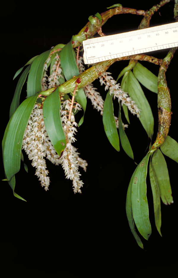 Found on Ambon Island of the Moluccas as a miniature sized, hot growing epiphyte with a stout creeping rhizome giving rise every 1.6 to 2" [4 to 5 cm] to club shaped pseudobulbs carrying 5 to 6 leaves that blooms in the summer on 4 to 6, drooping, 4.8" [12 cm] long, many flowered [90] inflorescence.