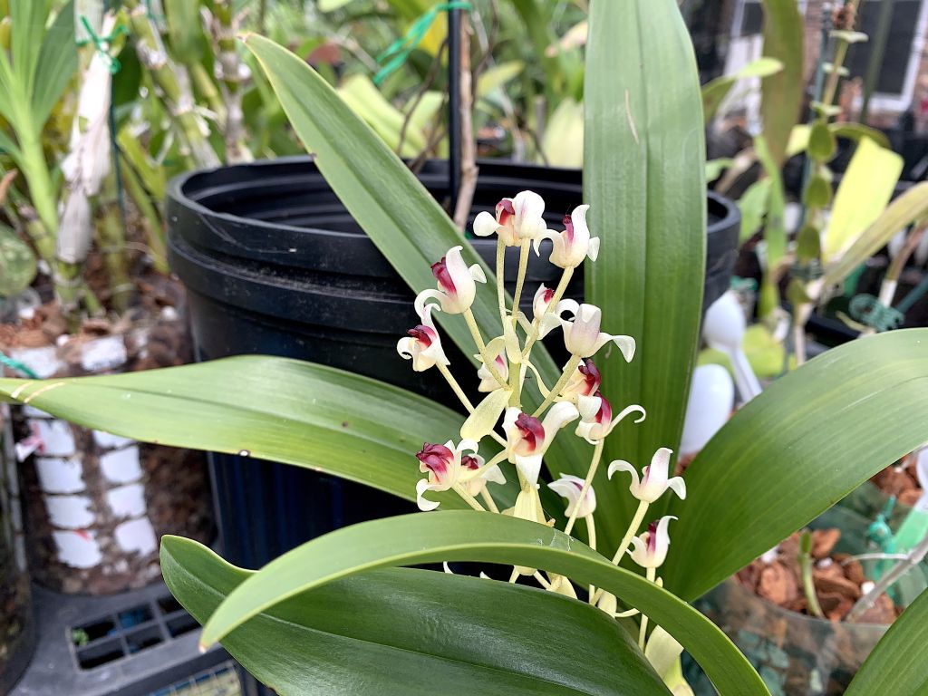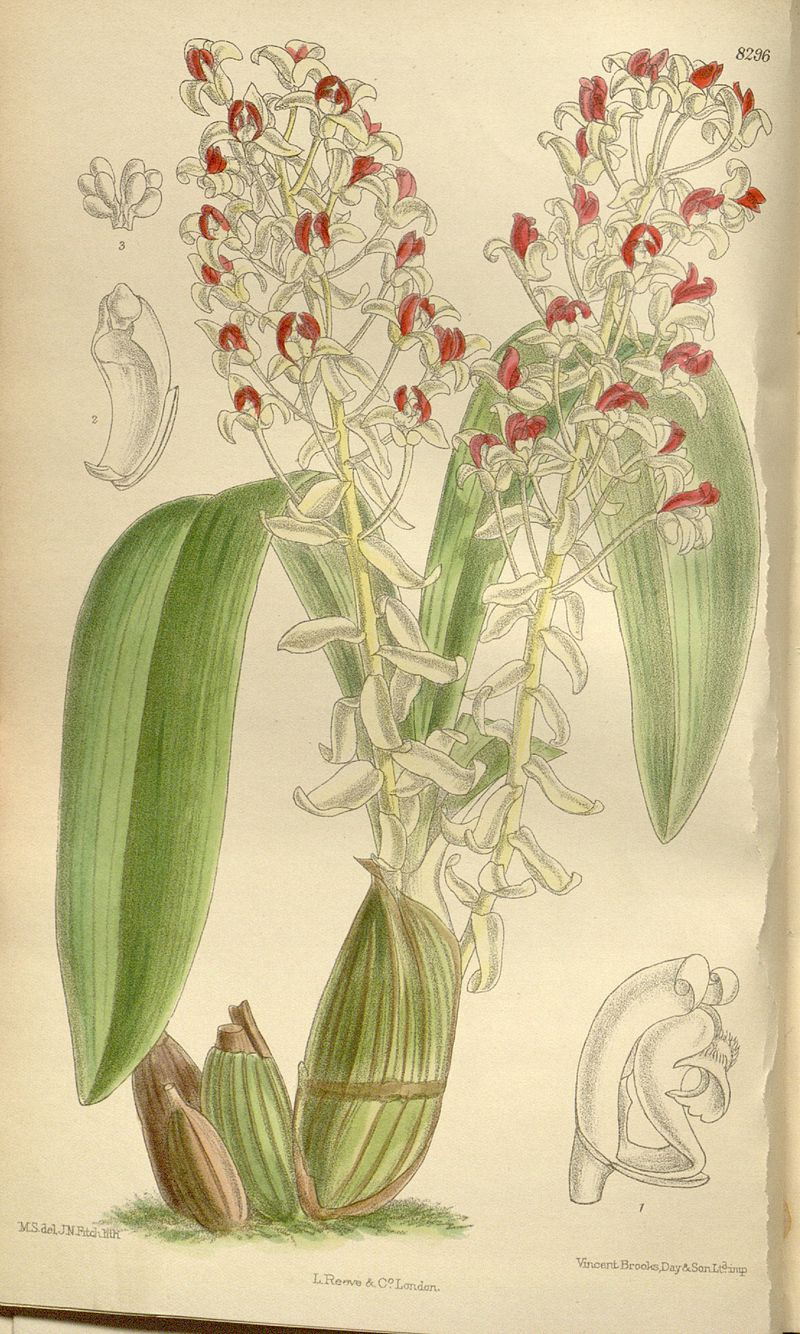 Found in The Philippines in Rizal province of Luzon, Busuanga and the Palawan Islands at elevations around 600 meters as a small sized, hot to warm growing epiphyte with erect, clustered, ovoid-oblong pseudobulbs carrying up to 4, leathery, oblong-lanceolate, nearly acute leaves that blooms in the winter and spring on an erect, sparsely pubescent, to 8” [20 cm] long, to 30 flowered inflorescence with oblong, nearly obtuse, membraneous bracts.