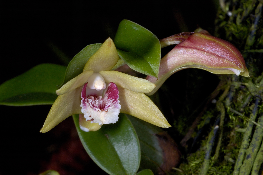 Found in Guangxi, Guizhou, Hainan and southeastern Yunnan provinces of China on trees in sparse woods and on rock faces in low forests at elevations around 500 to 1600 meters as a mini-miniature sized, warm to cool growing epiphyte or lithophyte with spaced, ovoid pseudobulbs carrying 2 apical, elliptic to ovate-elliptic, shortly petiolate base leaves that blooms in the spring on a subterminal, .4 to .8" [1 to 2 cm] long, single flowered inflorescence