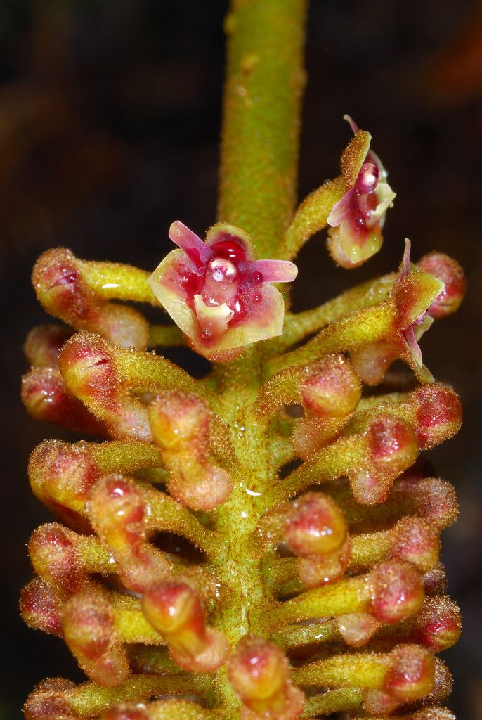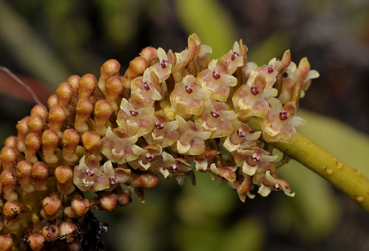 Found in Thailand, Malaysia, Borneo, Java, Sulawesi, Sumatra, New Guinea, Solomon Islands, New Caledonia, the Philippines, Fiji, Samoa, Vanuatu and Taiwan in lowland and montane primary forests at elevations around 300 to 2150 meters as a medium sized, hot to cool growing epiphyte with pseudobulbs enveloped completely by 4 to 7 sheaths and carrying 2 apical, linear-lanceolate, acute, gradually narrowing below into the elongate petiolate base leaves that blooms in the late summer and early spring on 1 to 2, arching, 12" [30 cm] long, densely many flowered inflorescence.