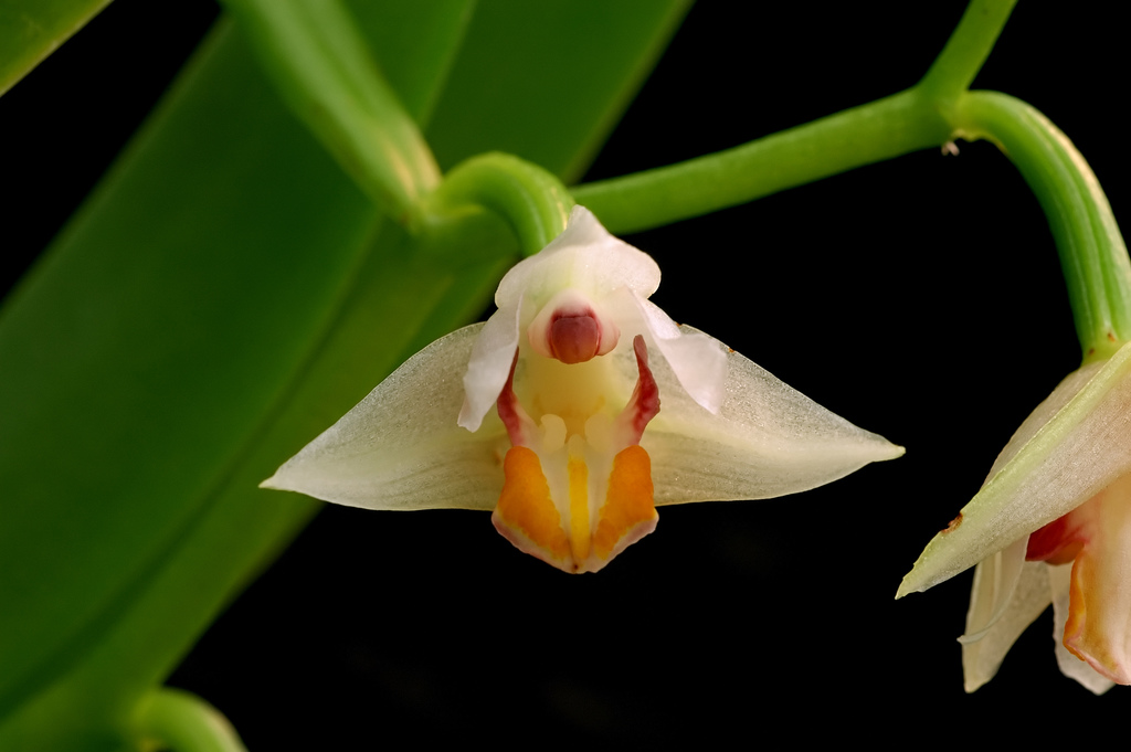 Found in Guangdong, and Hainan provinces of China and Hong Kong in dense forests on steep precipices and rock outcrops at elevations of 500 to 1300 meters as a small sized, warm to cool growing epiphyte with clustered, slightly compressed, becoming wrinkled, ovoid or conic pseudobulbs enveloped basally by 5 to 7 cataphyls and carrying a single, erect, leathery, linear-lanceolate to oblong, apiculate, gradually narrowing below into the cuneate petiolate base leaf and blooms in the spring on a terminal, nearly as long as the leaf, slightly compressed, green, glossy, glabrous, 4.8 to 6.8" [12 to 17 cm] long, zigzag, laxly 2 to 5 flowered inflorescence arising out of a newly forming growth.