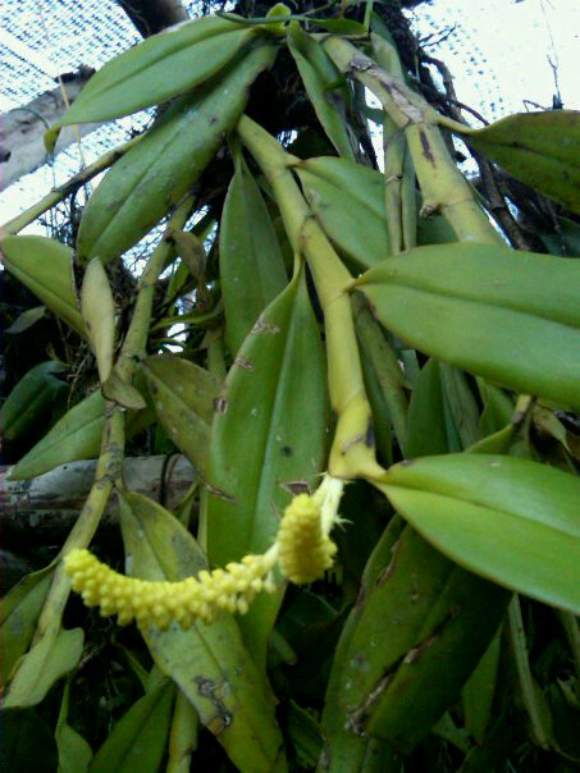 Found in Sumatra, Borneo and the Lesser Sunda Islands as a medium sized epiphyte with flattened, broad stems enveloped by acute basal sheaths and carrying lanceolate, acute, leathery leaves that blooms on a terminal, longer than the leaves,minutely pubescent, many flowered inflorescence with lanceolate, with a bristle at the apex, refelexed, glabrous floral bracts