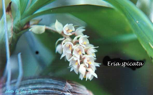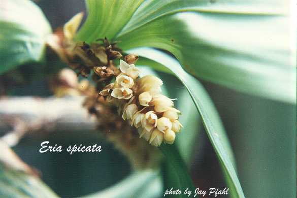 Often cited as Eria bractescens, major difference - E bractescens has 2 leaves at the apex of pseudobulb, larger more open acute flowers with no fragrance while E spicata has 4 near the apex leaves and smaller cupped flowers with fragrance.