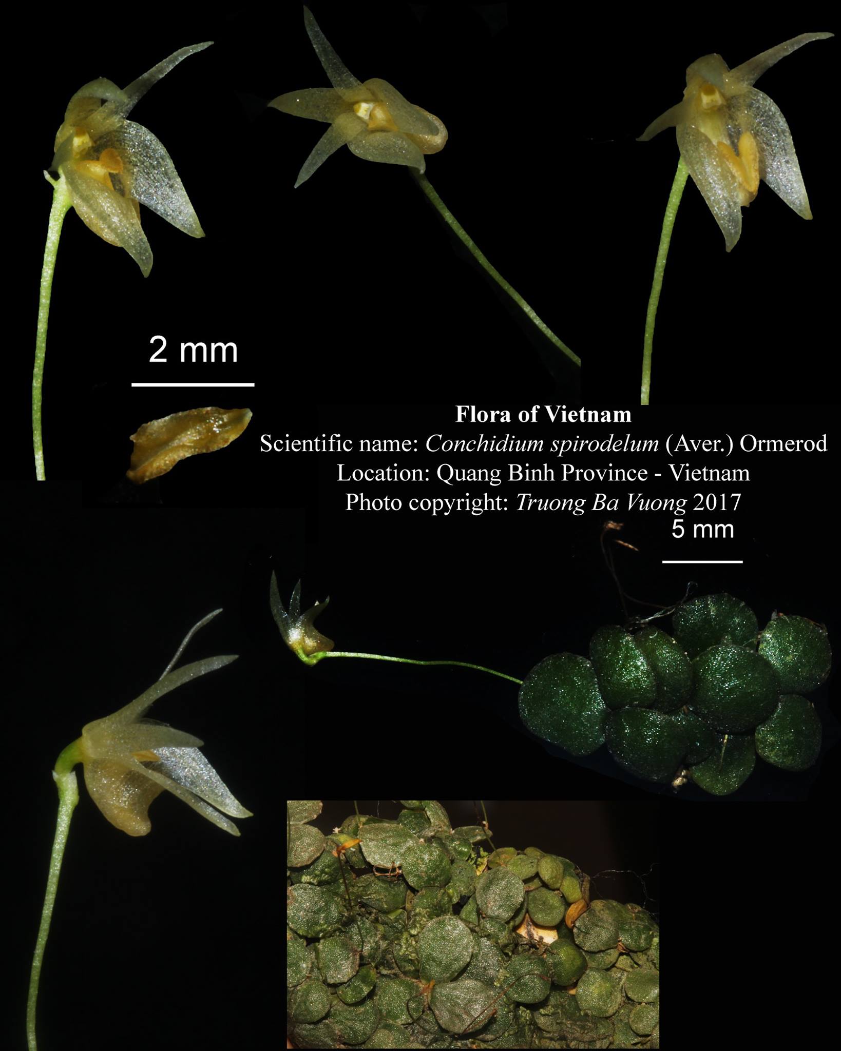 References W3 Tropicos, Kew Monocot list , IPNI ; Identification of the Orchids [Orchidaceae Juss.] Vietnam Averyanov 1994 drawing fide; A field Guide to the Wild Orchids of Thailand Vaddhanaphuti 2005 photo good; Turczaninowia 16(4):26-46 NEW AND RARE ORCHIDS (ORCHIDACEAE) IN THE FLORA OF CAMBODIA AND LAOS Averyanov 2013 ; Atlas of Native Orchids of China Vol 2 Jin Xiaohua, Li Jianwu and Ye Deping 2019 as Conchidium spirodelum photo fide;