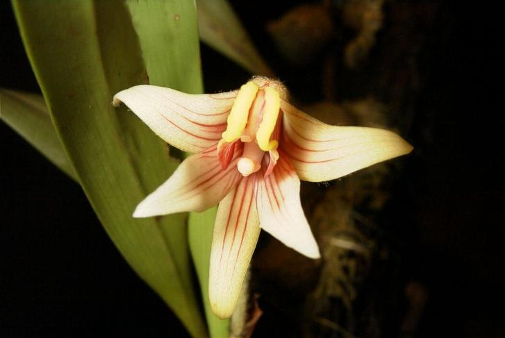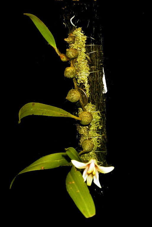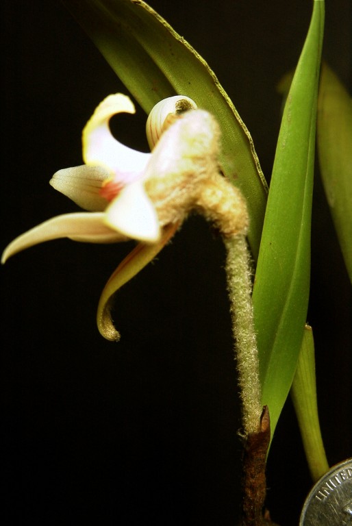 Found in Hainan province of China and Vietnam in evergreen lowland forests and highland primary cloud forests at elevations of 500 to 2200 meters as a miniature sized, warm to cold growing epiphyte with spaced, subglobose to ovoid pseudobulbs enveloped by a sheath in youth and carrying a single apical, narrowly elliptic to oblong, coriaceous, petiolate base leaf that blooms in the summer and fall on a terminal, erect, red brown tomentose, 1.2 to 1.6" [3 to 4 cm] long, single flowered inflorescence carrying very fragrant, non-resupinate flowers.