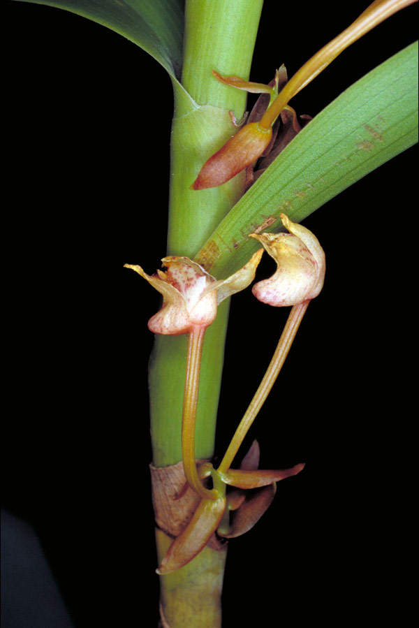Found Malaysia, Java, Sumatra and Borneo at elevations up to 1700 meters as a large to giant sized, hot to cool growing epiphyte with emering horizontal but becoming pendulous, elongate, leafy throughout stems carrying narrowly lanceolate, gradually narrowing towards the apex leaves that blooms on many, arising from nodes along the leafy stem, each 2 to 6 flowered inflorescence has triangular, acute floral bracts.
