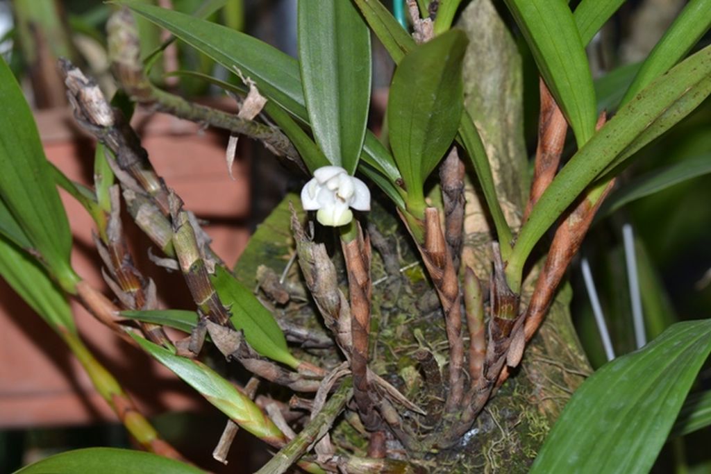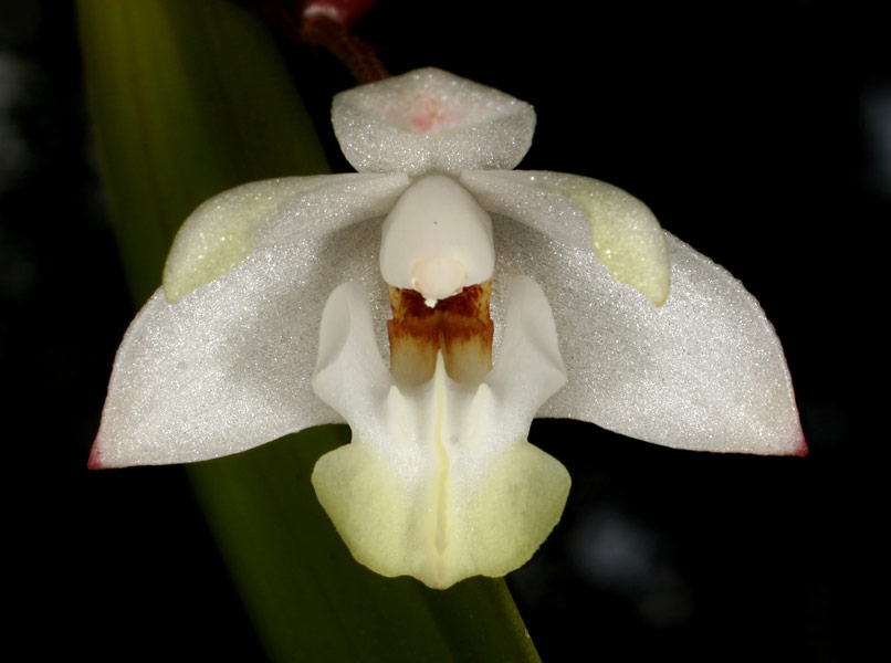 Found in Thailand, Malaysia, Borneo and Sumatra at elevations of 900 to 1500 meters as a medium sized, warm to cool growing epiphyte with stem like, elongate, somewhat thickened apically pseudobulbs enveloped basally by semi-tubular, acute, brown sheaths and carrying 2 to 3, lanceolate, acute, gradually narrowing below into the indistinct petiolate base leaves that blooms at most any time of the year on a single flowered inflorescence arising from above the leaves at the apex ot the stem and has a dull pink floral bract.