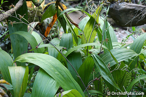 Found in northeastern India, Bhutan, Myanmar, Thailand and Vietnam in open forests or in forests margins on tree trunks at elevations around 1200 to 1700 meters as a medium to large sized, warm to cool growing epiphyte or lithophyte with sulcate, globose pseudobulbs enveloped basally by fibrous sheaths and carrying 1 to 3, plicate, 3 to 5 nerved, lanceolate, acute to acuminate, gradually narrowing below into the petiolate base leaves that blooms in the fall and winter on a basal, erect, laxly 9 flowered, narrowing from broad base, pubescent, slender, weakly fractiflex, to 32" [to 80 cm] long, racemose inflorescence with pubescent, lanceolate, acute floral bracts and carrying fragrant flowers