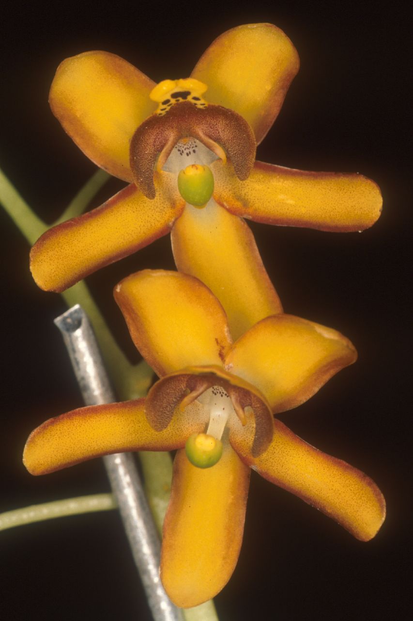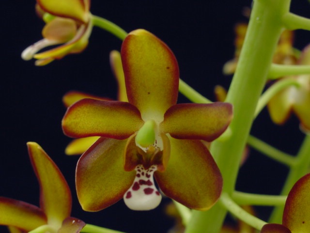Found in Venezuela, Ecuador, Peru and Brazil in the margins of flooded forests at elevations of 80 to 470 meters as a small sized, hot growing epiphyte with erect, robust, at first cylindrical, then slightly arcuate and carrying 2 to 4, erect, subcoriaceous, narrolwy lanceolate, narrolwy oblanceolate, to linear-oblong, acute to shortly acuminate, attenuate below into the base leaves that blooms in the spring on a basal, erect, racemose, 20 to 36" [50 to 90 cm] long, many flowered in the apical half inflorescence with 2 to 3 basal, subcoriaceous bracts and fleshy, triangular, obtuse to acute floral bracts.