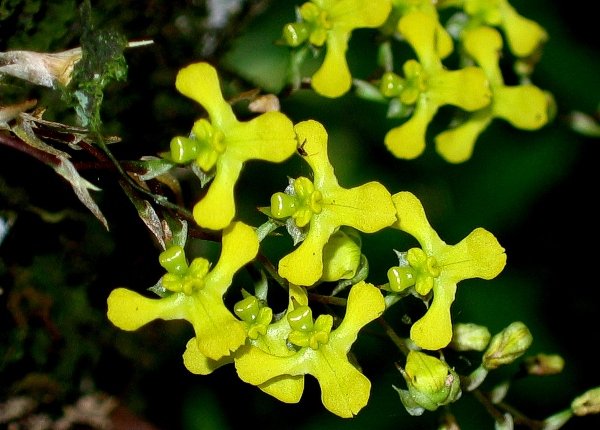 Found in coastal western Mexico in Nayarit, Jalisco, Michoacan, Guerrero, Mexico, Morelos and Oaxaca in the Sierra Madre del Sur and the transverse Volcanic belt on slender branches and twigs in pine-oak forests at elevations of 1200 to 2250 as a miniature sized, warm to cool growing epiphyte meters with clustered, ovoid, subspherical to ellipsoid, laterally compressed, smooth, transluscent, pale green, often purple brown speckled pseudobulbs enveloped partially by 4 to 6 imbricate, some leafbearing sheaths and carrying 1 to 2 apical, deciduous, thin, lanceolate, acute leaves that blooms in the winter through spring on 1 to 3, pendant to lateral, few to many [4 to 25] flowered, racemose, sinuous to flexuous inflorescence carrying the showy flowers in two rows .