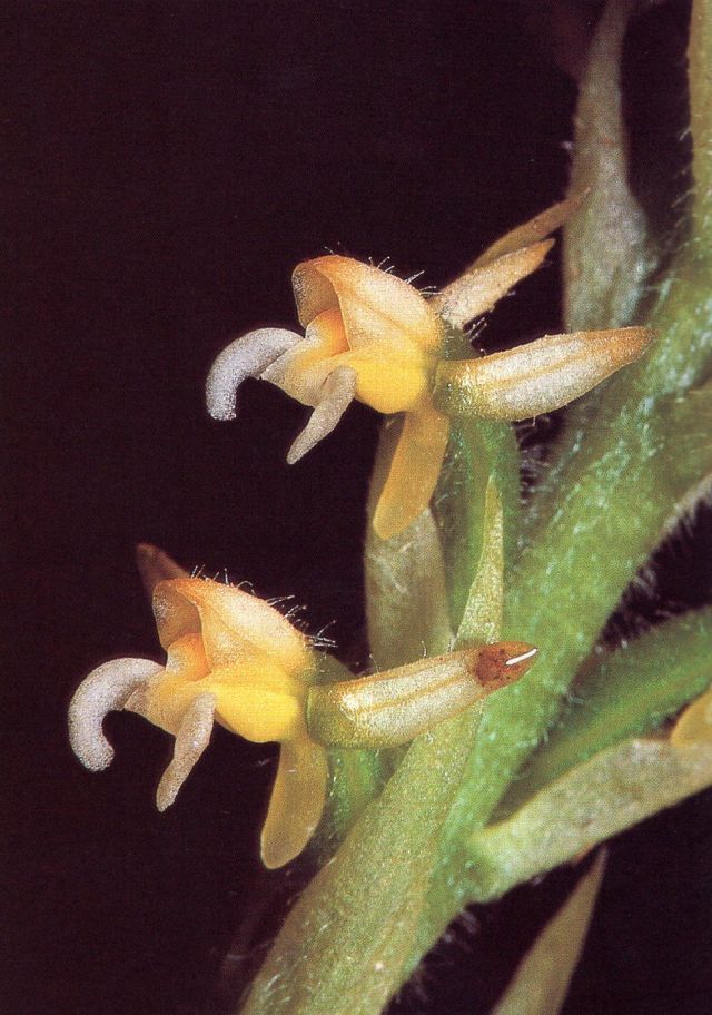 Found in Colombia and Ecuador in very wet montane forests at elevations around 600 meters as a miniature sized, warm growing epiphyte or terrestrial with a creeping stem giving rise to a loose rosette of 3 or so, narrowly elliptical, plicate, acute leaves that blooms in the summer on a terminal erect, 6" [15 cm] long, densely many flowered inflorescence enveloped by several, loose, pubescent, elongate, triangular, acute bracts