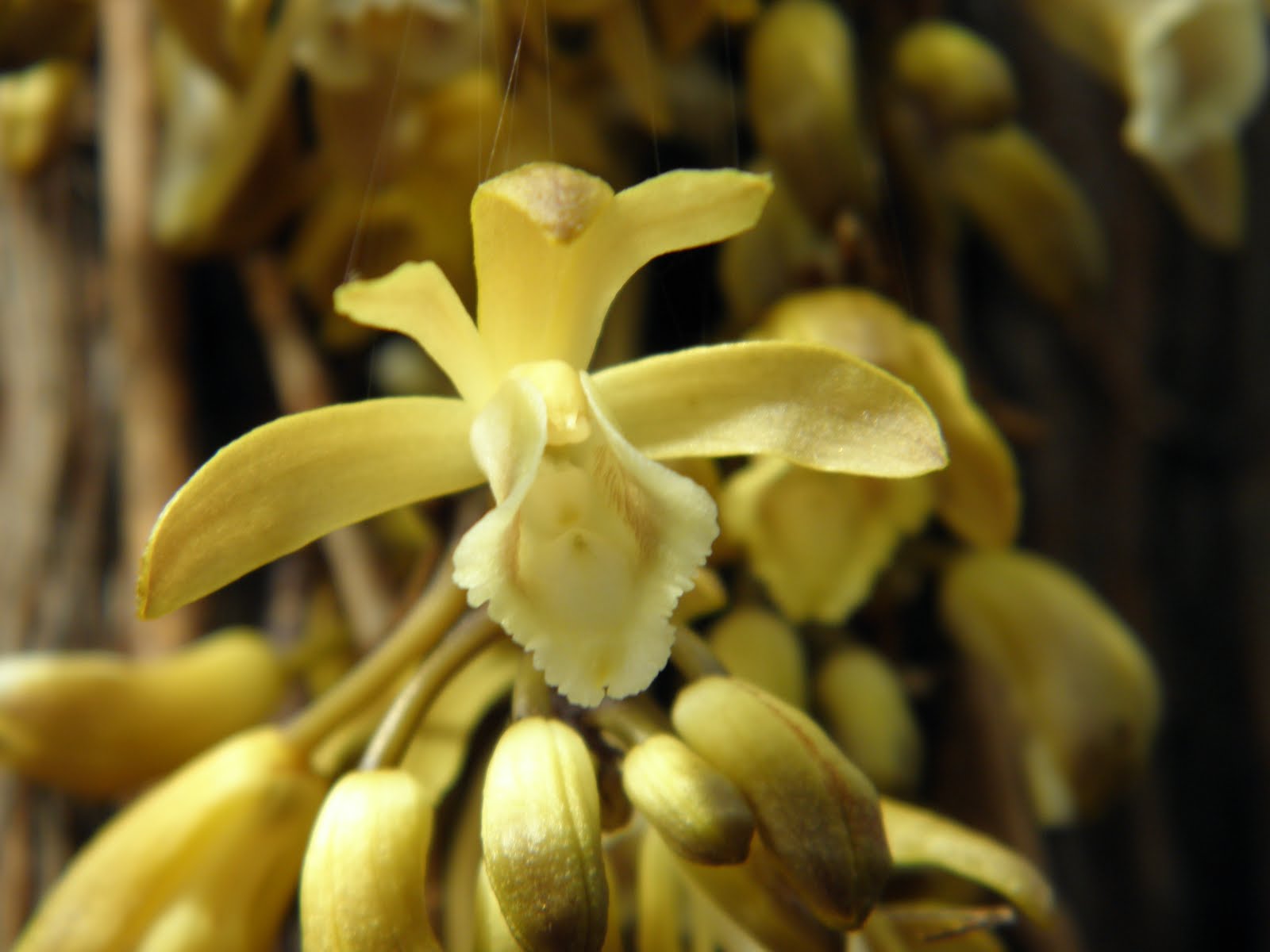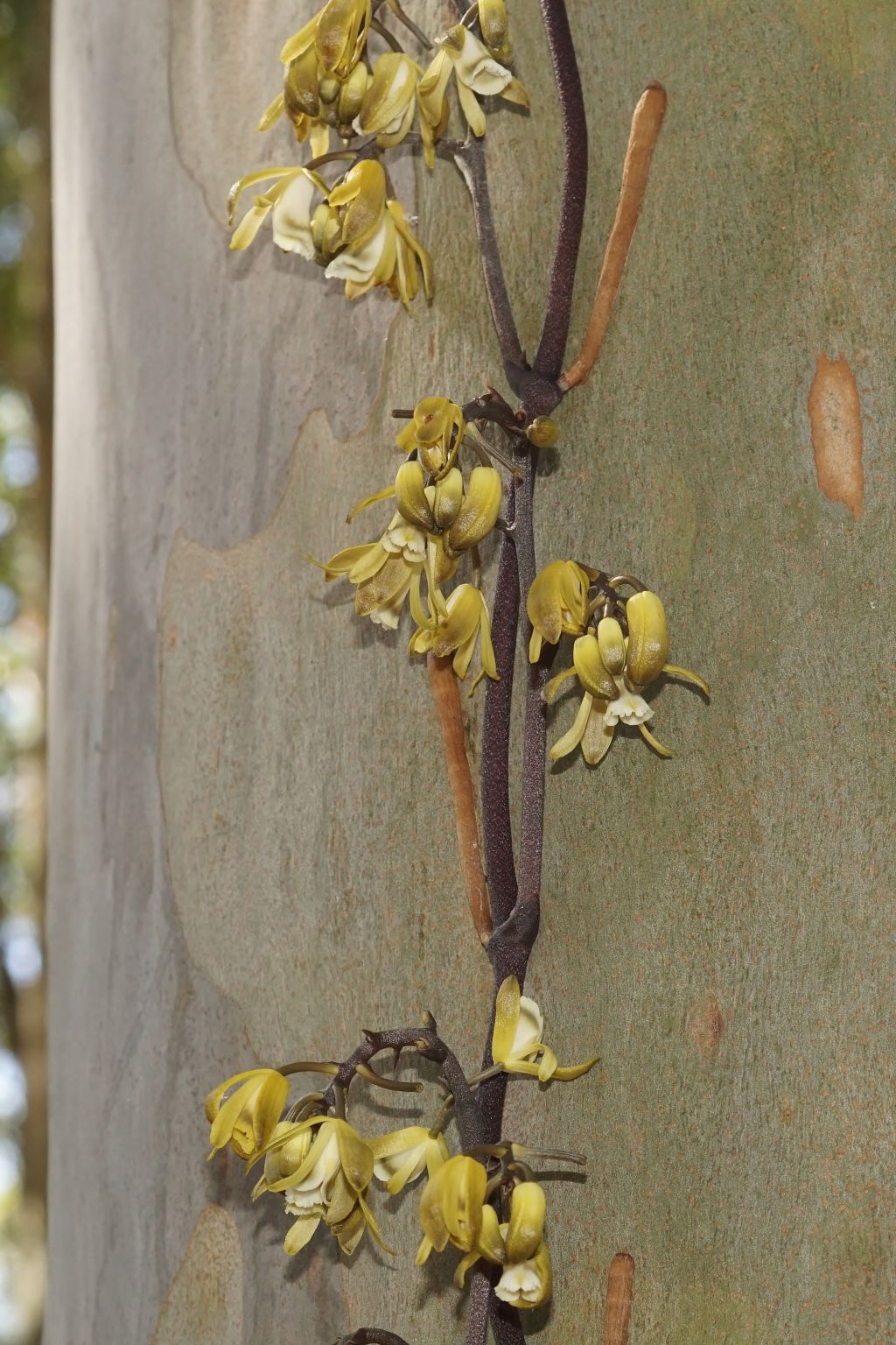 Found in Queensland and New South Wales Australia at elevations of 50 to 500 meters in open forests on stumps, logs and other wood at a suitable state of decay often in full sun locations as a large [240" - 600 cm] sized, hot to warm growing, vine like, Mycoheterotrophic orchid with an elongate, dark brown to blackish, wiry stem that blooms in the winter and spring on an axillary, pendant or lateral, large, paniculate, each branch 3.2 to 6" [8 to 15 cm] long, several to many [up to 1000] flowered inflorescence with pleasingly fragrant flowers.