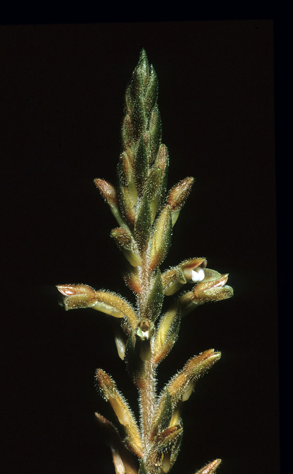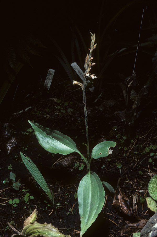 Found In Malaysia, Sumatra and Java in light forests at elevations of 200 to 1200 meters as a medium sized [in flower], hot to cool growing terrestrial with more or less 6, in the basal third of the stem, well spaced, ovate, apiculate, petiolate base [usually less than .8" [2 cm] long, leaves that blooms in the late winter and early spring on an erect, to 6" [15 cm] long, peduncle, the rachis to 2.8" [7 cm] long, 8.8" [22 cm] long overall, more or less to 10 flowered inflorescence.