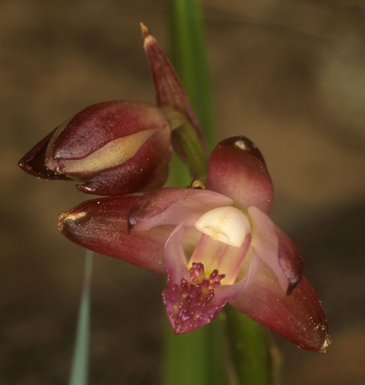 A color variety of the previous species with concolor greenish white to pink tinged green to dark reddish purple flowers with the lip crests being yellowish green to white.