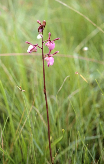 Found in Guinea, Central African Republic, Zaire, Rwanda, Burundi, Uganda, Tanzania, Angola, Malawi and Zambia at elevations of 600 to 1350 meters in seasonally wet dambo grasslands as a medium to large sized, warm to cool growing terrestrial with subterranean tubers giving rise to 1 to 2, erect, linear, ribbed grass-like leaves that are absent or just begining to arrive at blooming in the later spring on an erect, rather laxly 3 to 7 flowered inflorescence which is covered by 3 to 4 scattered scarious bracts and carries lanceolate, acuminate or aristate floral bracts