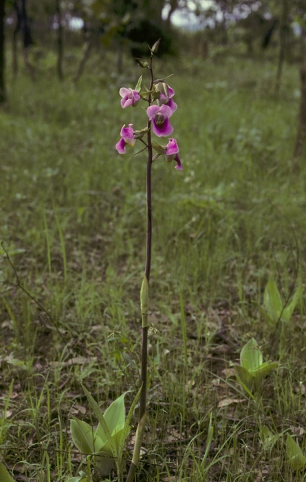 Found in Benin, Burkino, Gambia, Ghana, Guinea-Bissau, Guinea, Ivory Coast, Mali, Nigeria, Senegal, Sierra Leone, Togo, Burundi, Central African Republic, Cameroon, Gabon, Congo, Rwanda, Zaire, Chad, Ethiopia, Sudan, Kenya, Tanzania, Uganda, Angola, Malawi, Mozambique, Zambia, Zimbabwe, Natal and Madagascar in woodlands, scrub, rough grasslands and drier marshes and on the edges of ant hills in short grass swamps at elevations of 200 to 2300 meters as a large to giant sized, hot to cold growing, slender terrestrial with underground, irregularly shaped and in a chain pseudobulbs giving rise to 3 to 4, plicate, erect, linear leaves after or with blooming occuring in the spring and summer on an erect, 2 to 9 flowered inflorescence carrying showy flowers.
