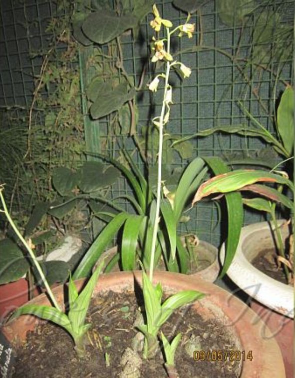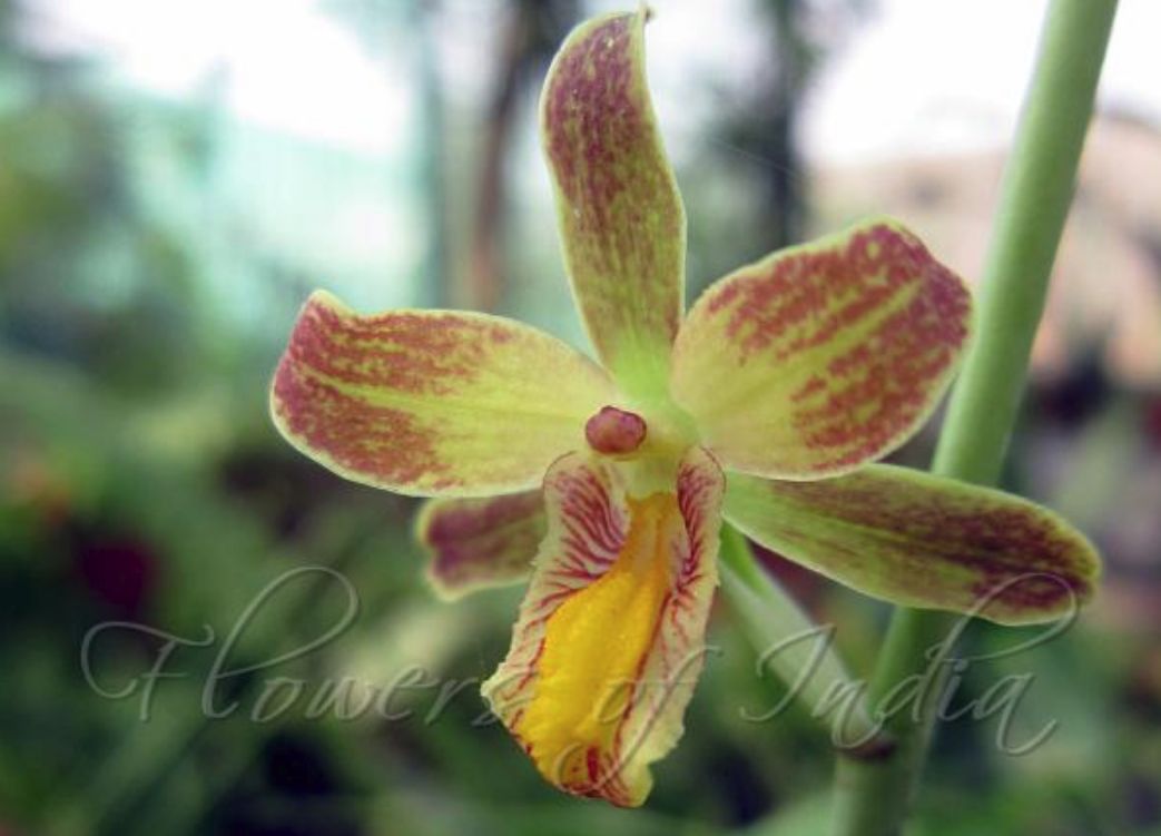 Found in the western Himalayas, India and Nepal at elevations around 850 to 1000 meters as a small sized, warm growing epiphyte with an ovoid, annulated pseudobulb carrying immature at flowering, lanceolate becoming broadly elliptic-lanceolate, acuminate, plicate, 7 veined, tapering below into the petiolate base leaves that blooms in the spring on an, arising from below the summit of the pseudobulb, 20 to 25" [50 to 65 cm] long, laxly many flowered inflorescence with 2, loose, basal sheaths and shorter than the ovary floral bracts.