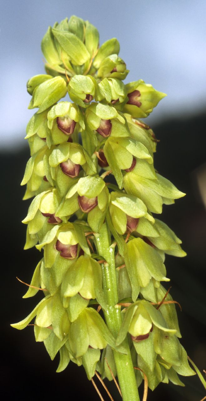 Found in Zimbabwe, Lesotho, Swaziland, Cape Province, Natal, Orange Free State and Transvaal South Africa in submontane grasslands and Vlei margins at elevations of 1500 to 1650 meters as a medium to large sized, cool growing terrestrial with subterranean tubers giving rise to an erect stem carrying 3, erect, linear, plicate leaves that are partly to fully developed at flowering which occurs in the spring and early summer on a stout, elongate, 8 to 18" [20 to 45 cm] long, fairly densely several to many [6 to 50] flowered inflorescence enveloped by several loose sheaths and carries flowers that do not open widely.