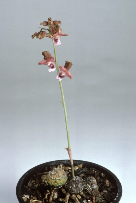 Found in Zaire, Angola, Malawi, Tanzania, Zambia and Zimbawe in mixed deciduous woodlands and recently burned grasslands at elevations of 900 to 1770 meters as a small to medium sized, warm to cool growing terrestrial with partially above the ground pseudobulbous growths giving rise to 3 to 4, ovate to oblong-elliptic, obtuse, plicate leaves that are not present at blooming in the spring on an erect, fairly densely to 30 flowered inflorescence with 2 to 3 loose, tubular bracts towards the base and 1 to 2, linear-lanceolate, bracts farther up.