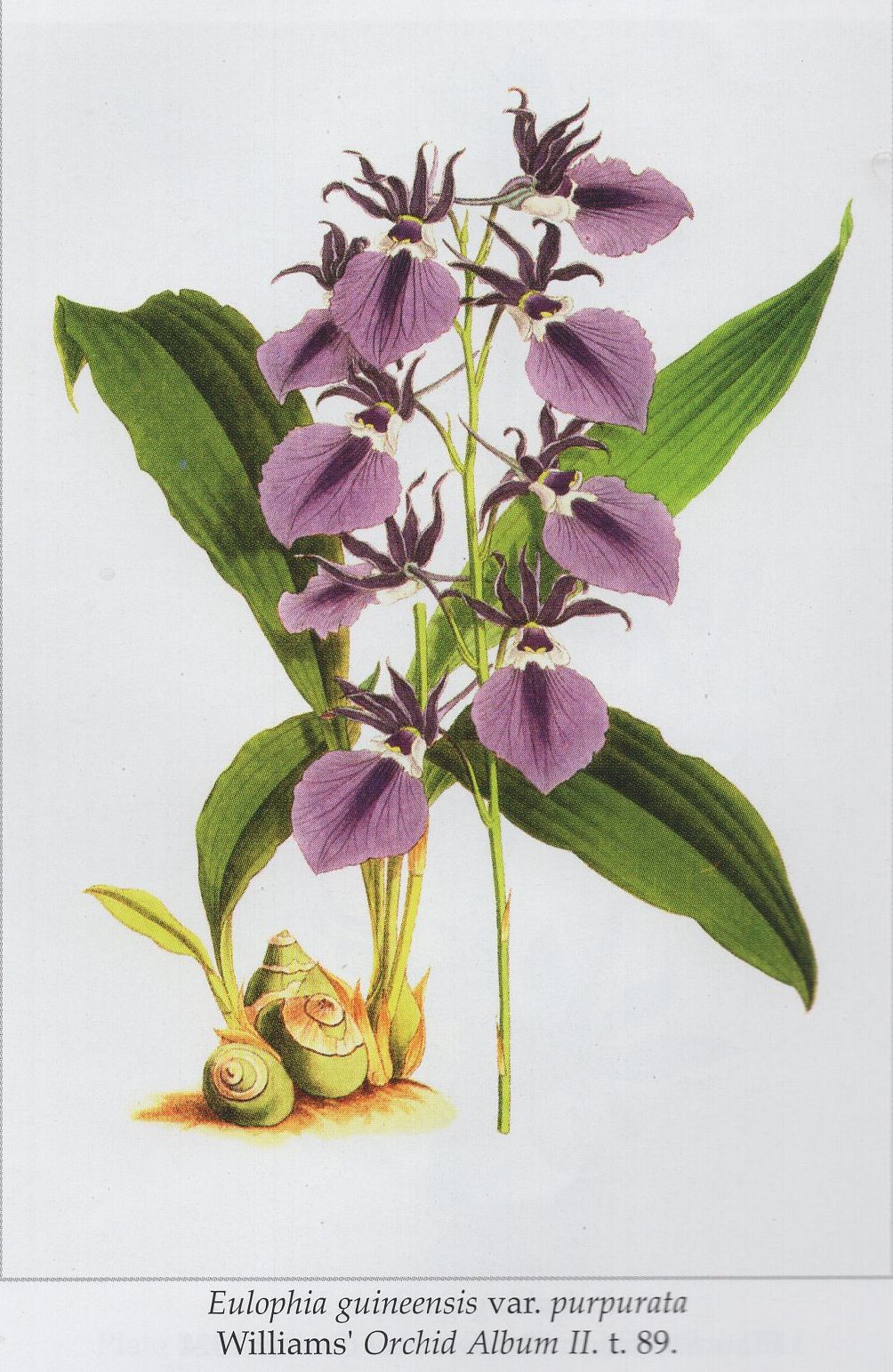 References W3 Tropicos, Kew Monocot list , IPNI ; Otia Botanica Hamburgensia Rchb.f 1878; Die Orchideen Schlechter 1915; Atlas des Orchidees Cultivees Constantin 1920 drawing fide; AOS Bulletin Vol 26 No 5 1957 drawing fide; ; West African Lilies and Orchids Morton 1961 drawing fide; AOS Bulletin Vol 32 # 10 1963; Encyclopedia of Cultivated Orchids Hawkes 1965 as E quartiniana photo ok; Orchids of East Africa Piers 1968 as E congolensis; Orchids of East Africa Piers 1968 as E guineeniss; AOS Buletin Vol 38 No 1 1969 photo fide; AOS Bulletin Vol 39 No 10 1970 photo fide; AOS Bulletin Vol 39 No 10 1970 as E quartiana; AOS Bulletin Vol 44 #4 1975 as E quartiana; The Orchids of South Central Africa Williamson 1977 as E quartiniana drawing/photo fide; AOS Bulletin Vol 52 No 1 1983 as E quartiana photo fide; Orchids of the Central African Republic - A Provisional Checklist Cribb & Fay 1987; Simon & Schuster's Guide to Orchids Schuler 1988 photo fide; Flora of Tropical East Africa Orchidaceae Part 3 Cribb 1989 drawing/photo fide; Rudolf Schlechter Die Orchideen Band 1B lieferung 24 1457 - 1520 Brieger 1991 as E quartianana drawing/photo fide; Rudolf Schlechter Die Orchideen Band 1B lieferung 24 1457 - 1520 Brieger 1991; Schlechteriana Vol 2 No 1 1991 as Eulophia quartiniana photo fide; The Illustrated Encyclopedia of Orchids Pridgeon photo fide; The Manual Of Cultivated Orchid Species Bechtel, Cribb and Launert 1992 photo fide; Manual Of Orchids Stewart 1995 drawing fide; Orchids of Kenya Stewart 1996 photo fide; African Orchids in the Wild and in Cultivation La Croix 1997 photo fide; Flora Zambesiaca Vol 11 Orchidaceae Part 2 Pope 1998 photo fide; Les Orchidees de Cote d'Ivorie Perez-Vera 2003 photo/drawing fide; Field Guide to the Ethiopian Orchids Demissew, Cribb & Rasmussen 2004 photo/drawing fide; Australian Orchid Review Vol 70 No 4 2005; Orchid Digest Vol 72 #2 2008 drawing/photo fide; Orchid Digest Vol 72 #2 2008 as E guineensis var purpurata photo fide; AOS Bulletin Vol 77 No 1 2008 photo fide; Terrestrial African Orchids, A select Review John S. Ball 2009 drawing fide; Genera Orchidacearum Vol 5 Epidendrodeae Part 2 Pridgeon, Cribb, Chase and Rasmussen 2009; Le Petit Larousse des Orchidees Lecoufle, Barthelemy and Schmidt 2013 photo fide; AOS Bulletin Vol 86 #4 2017 photo fide; AOS Bulletin Vol 86 # 8 2017 drawing fide;