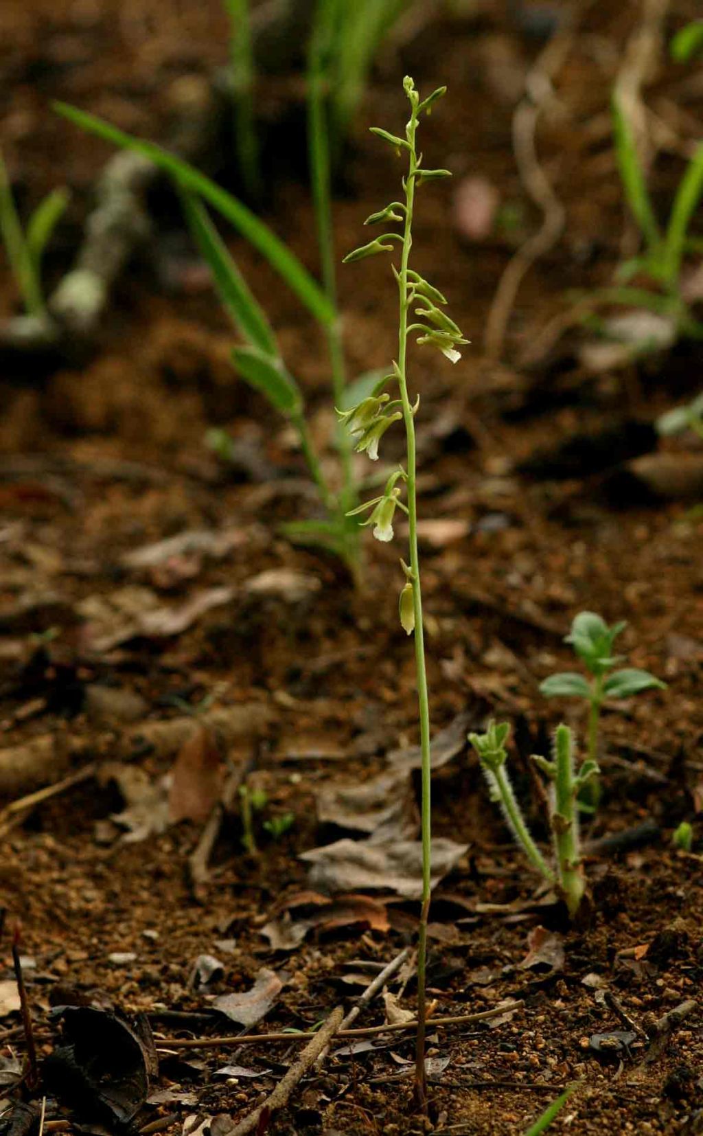 Found in Ivory Coast, Central African Republic, Zaire, Tanzania, Malawi, Zambia, Angola, Zimbabwe and Mozambique in Brachystegia woodlands at elevations of 500 to 1500 meters as a very small sized, slender, warm to cool growing terrestrial. This is one of the smallest and most inconspicuous species in the genus, usually less than 15 cm tall, and likely to be overlooked. It is leafless at flowering time which is in the spring. The orchid has subterraean, ovoid to elliptic, several noded tubers giving rise to 2 to 7, vestigal, brownish, leaves that blooms on 1 to 3, 7 to 20 flowered, often secund, inflorescence with a median, short sheath. Flowers drooping and not opening widely.