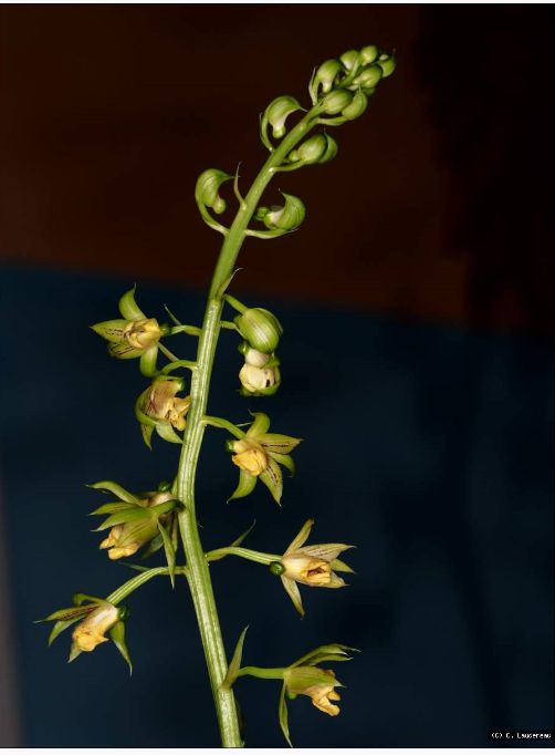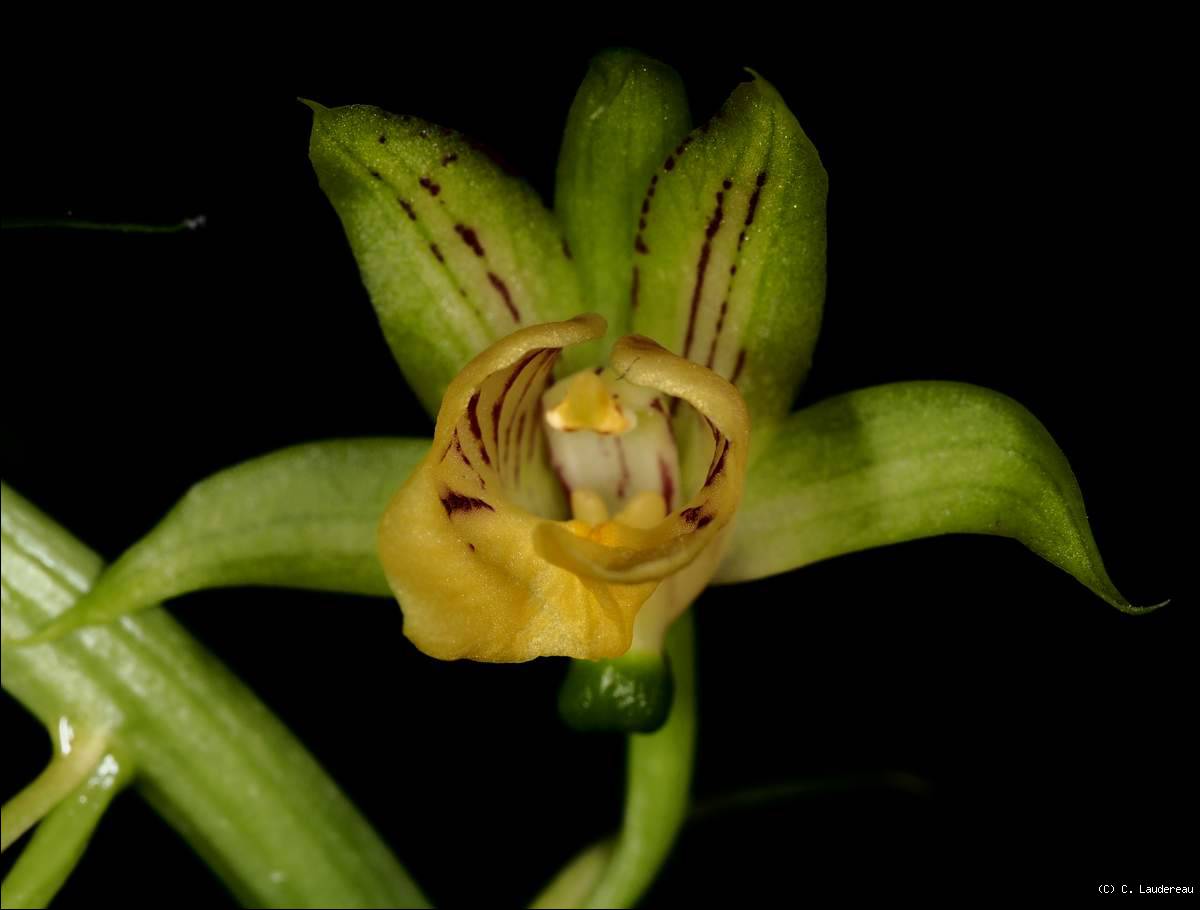 Found in New Caledonia in humus rich forests as a medium to large sized, hot growing terrestrial with cigar shped, robust pseudobulbs carrying 2 to 3, leaves that blooms in the fall on erect, to 30.4" [76 cm] long, many flowered inflorescence.